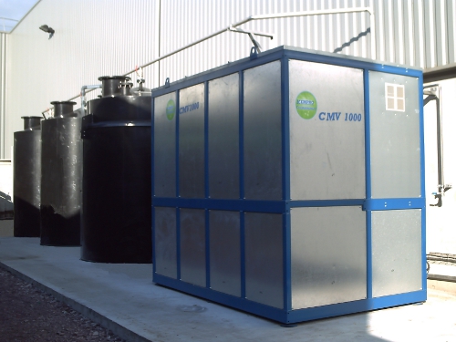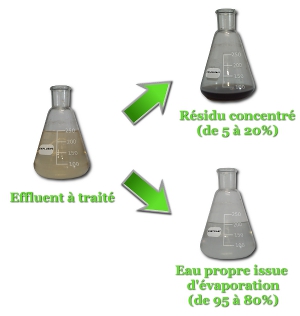 L’évaporation sous vide permet de diviser une solution aqueuse chargée en sels minéraux en une solution plus concentrée (le concentrât) et une solution épurée (le distillat). L’originalité de la CMV (Compression Mécanique de Vapeur) est que l’énergie de condensation à (100°C pour l’eau) est entièrement utilisée pour évaporer la solution à traiter (85°C à –0,4 barg pour une solution aqueuse). Le bilan énergétique se réduit à la puissance de mise en dépression des vapeurs. Ce qui en fait un procédé particulièrement attractif en matière énergétique. Ce procédé est particulièrement adapté pour recycler des rejets liquides de faible concentration.