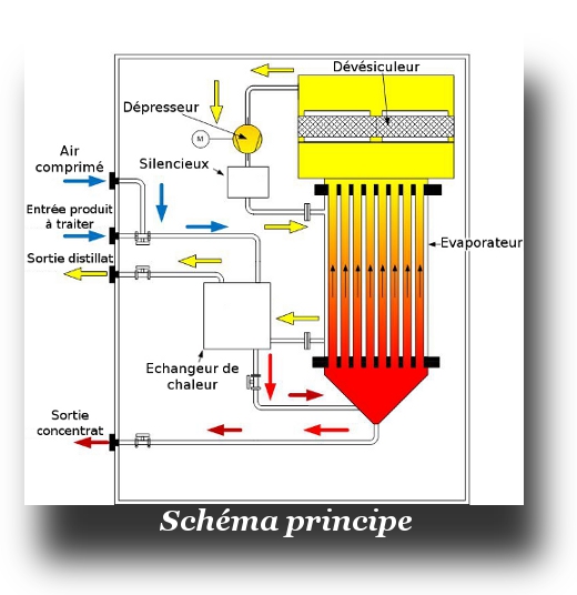 Principe de fonctionnement L’eau à traiter est envoyée dans un évaporateur côté tubes, dans lesquels la vapeur d’eau libérée est aspirée par un dépresseur. Les vapeurs comprimées sont ensuite condensées dans l’évaporateur côté calandre qui fonctionne comme un échangeur avec côté tube l’eau brute et côté calandre le distillat. Le distillat est chassés de l’évaporateur par un contrôle de niveau et le concentrât est évacué par un contrôle de concentration et une pompe de relevage.