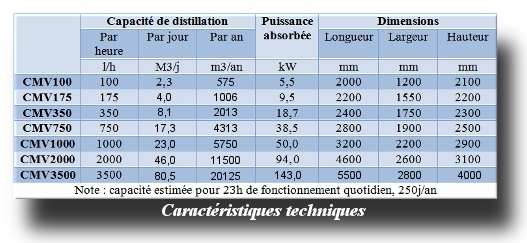 Montage et mise en œuvre Les CMV sont fournies sur châssis avec leur système de contrôle commande prêt à l’emploi pour un fonctionnement 24h/24. Les paramètres de commande de l’automate sont accessibles par l’opérateur pour régler la machine en fonction des variations de la charge. Un bac de rétention permet de recueillir les égouttures éventuelles. Le système est compact et est entièrement capoté pour limiter les nuisances sonores. Parfois un prétraitement est rendu nécessaire, comme l’ajustement du pH, la filtration de solides, le déshuilage, le contrôle du moussage,… Un post traitement peut également se révéler nécessaire en fonction de l’utilisation du condensat en aval : charbon actif, osmoseur,… Enfin en raison de contraintes d’exploitation, on peut être amené à installer des cuves tampon de stockage de concentrât et/ou de distillat, unn système anti-mousse. Dans la plupart des cas, l’ensemble des équipements en contact avec l’eau est construit en inox 1.4404 pour des raisons de résistance à la corrosion. Parfois, si l’effluent est particulièrement agressif, on pourra utiliser des matériaux plus résistants encore.