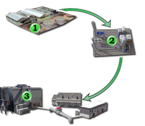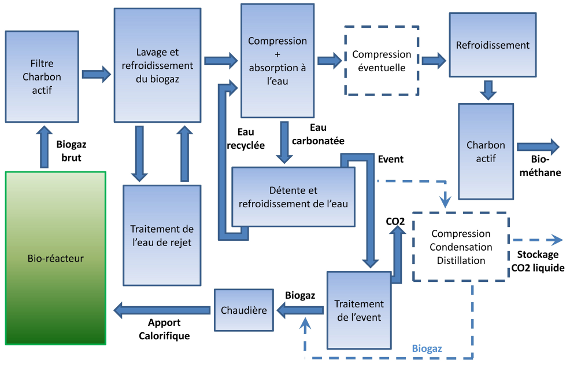 Le biogaz doit être purifié pour constituer un bio-méthane (97 % de méthane) avant de l’injecter dans un réseau de transport de gaz naturel ou de l’utiliser comme carburant sur des moteurs diesel de véhicules industriels ou agricoles. On doit principalement lui enlever son dioxyde de carbone et sa vapeur d’eau pour contenir un minimum de méthane (97%) et constituer un bio-méthane (méthane d’origine biologique). Kempro Environnement propose son procédé UEB (pour Unité d’Epuration de Biogaz). Ce procédé breveté se déroule en cinq ou six étapes selon le degré de pression requis pour la livraison du bio-méthane. - Une désulfuration au charbon actif à pression atmosphérique pour éliminer l’hydrogène sulfuré et les siloxanes. - Une déshydratation primaire par condensation de l’eau dans un refroidisseur . - Un lavage à l’eau sous pression pour éliminer le dioxyde de carbone. - Une compression secondaire éventuelle pour porter le gaz à la pression requise. - Une déshydratation secondaire dans un refroidisseur pour éliminer la vapeur d’eau résiduelle. - Une élimination des hydrocarbures résiduels sur charbon actif. En option nous proposons le traitement de dioxyde de carbone pour le valoriser soit en CO2 liquide de qualité alimentaire soit en CO2 gazeux pour des utilisations agricoles locales.